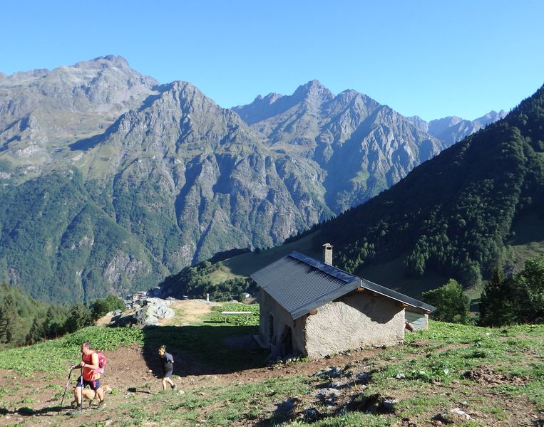 Il sentiero entra nel bosco con vista tra nuvole sul gruppo del Diavolo di Tenda e i massicci del Redorta e del Coca saliamo l’ampio prato per poi rimontare con una serie di svolte il ripido versante boschivo, che si apre successivamente nel pascolo piegando a sinistra alla Baita Asta Bassa (1426 m).
