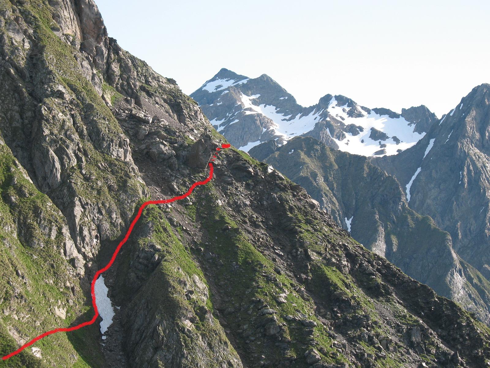 La salita al passo avviene lungo ripidi pendii erbosi e canali rocciosi che richiedono attenzione costante.