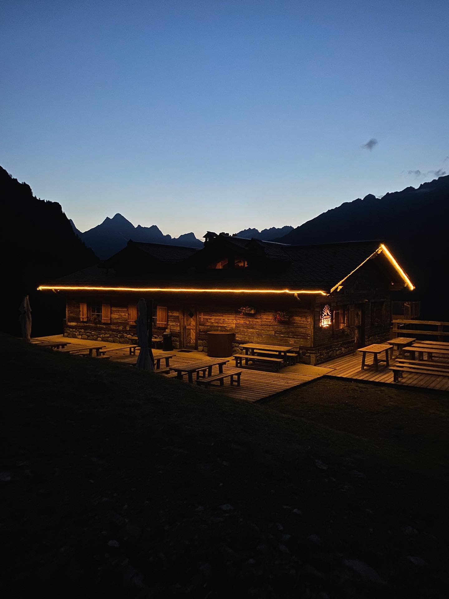 Il Rifugio Due Baite si trova lungo le piste da sci a Lizzola, con vista panoramica su alcune cime orobiche sopra i 3000 metri (Pizzo Redorta e Pizzo Coca).