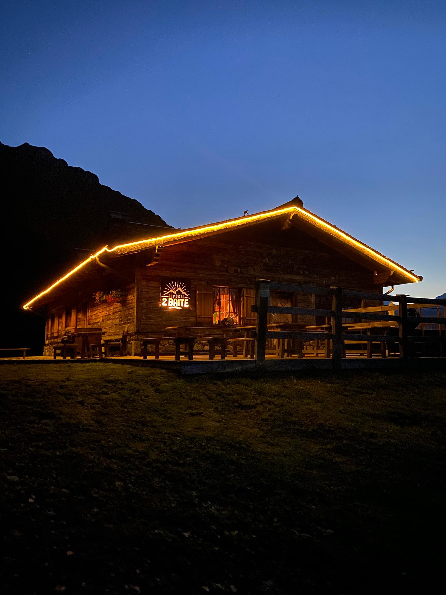 Il Rifugio Due Baite si trova lungo le piste da sci a Lizzola, con vista panoramica su alcune cime orobiche sopra i 3000 metri (Pizzo Redorta e Pizzo Coca).
