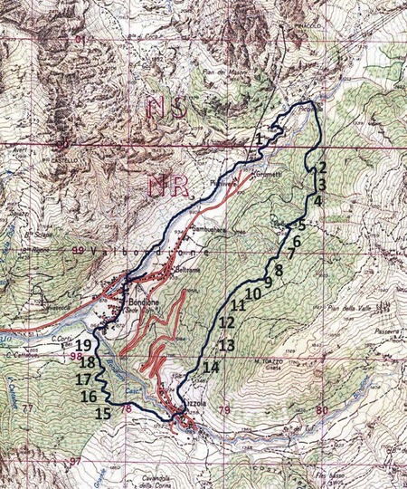 Ne abbiamo selezionato 13 lungo il sentiero che da Valbondione conduce a Lizzola passando per Maslana e Valbona e 5 lungo il sentiero da Lizzola a Valbondione. 19 in tutto.