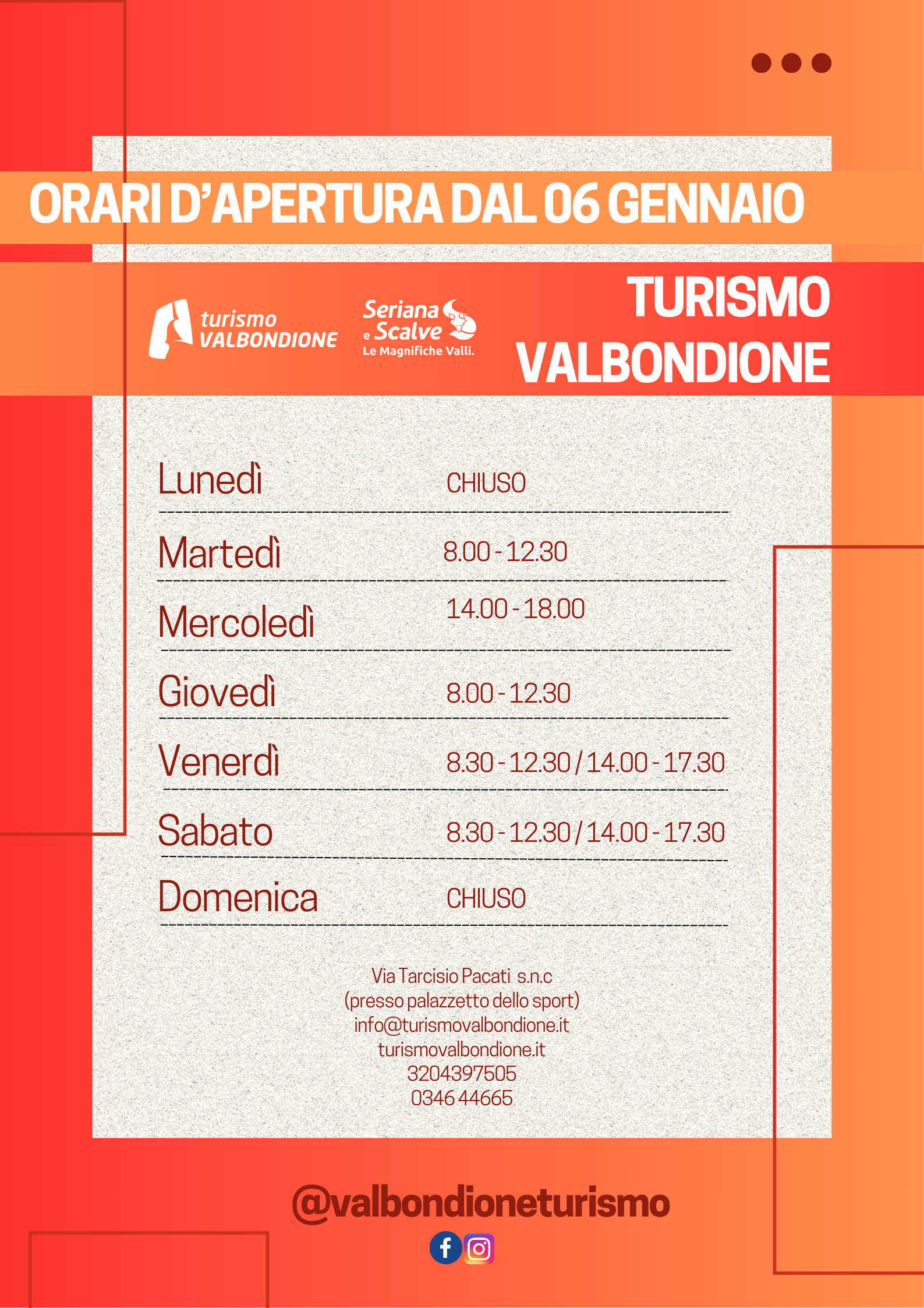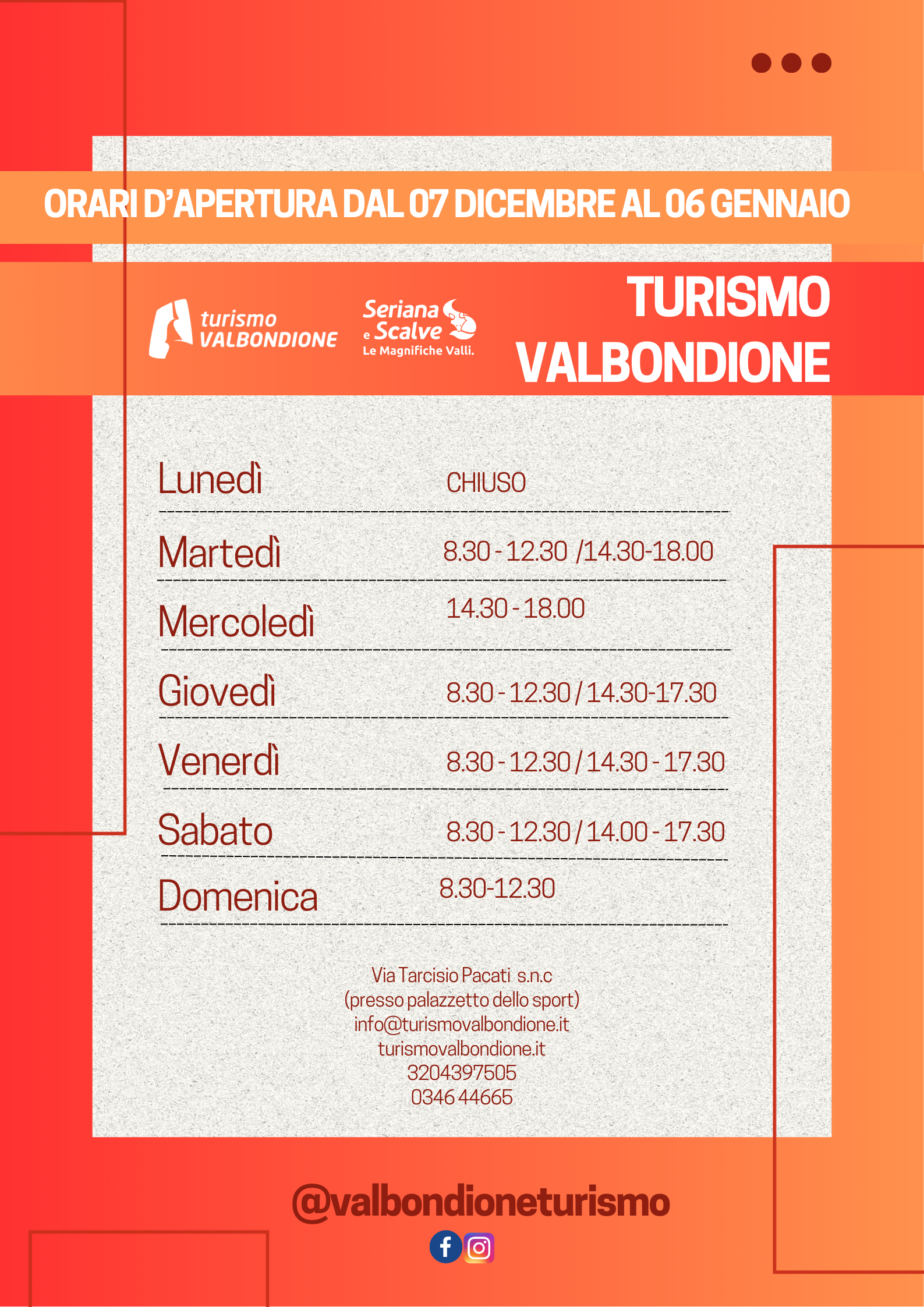 Consulta gli orari d’apertura di Turismo Valbondione qui: